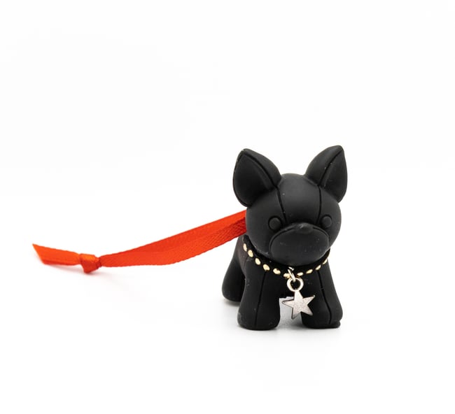Miniature black French Bulldog with ornamental collar; attached to red satin ribbon. Packaged in a House shaped candy box and comes with a pom beanie to keep puppy warm in those winter months! .