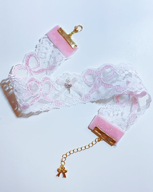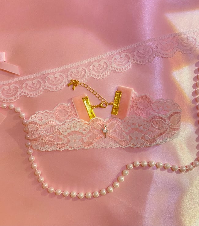 White and pink bow patterned lace choker with two style options:
